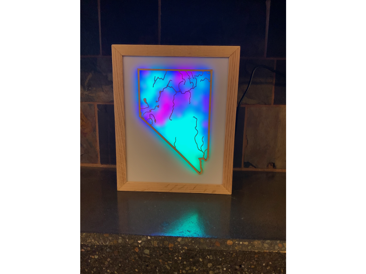 This Firefly Rivers Map features a beautiful laser-cut birch map showing off Nevada's rivers including the Humboldt, Reese, White, Colorado and more. Lit by over 1000 LED pixels, this unique piece of artwork will illuminate any room with a soft, colorful glow.